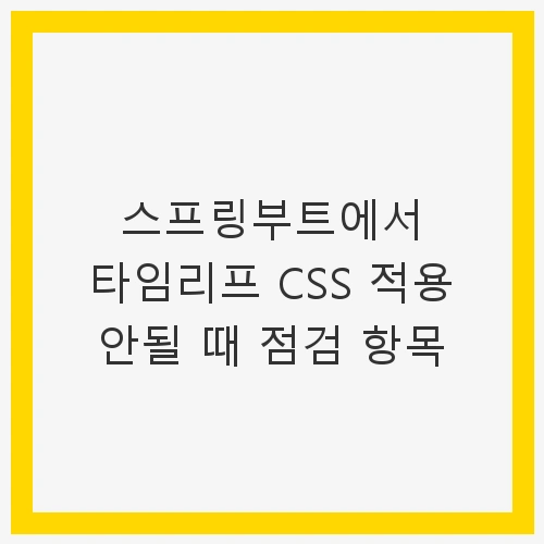스프링부트에서 타임리프를 사용할 때 CSS가 적용되지 않는 문제는 여러 가지 원인으로 발생할 수 있지만, 위에서 소개한 점검 항목들을 통해 문제를 해결할 수 있습니다. 잘못된 경로 설정, 시큐리티 설정, 브라우저 캐시 등 다양한 요소가 CSS 적용에 영향을 미칠 수 있으므로, 각 요소를 하나씩 점검하는 것이 중요합니다. 최종적으로, CSS가 정상적으로 적용되었다면 사용자에게 매력적이고 효과적인 웹 페이지를 제공할 수 있습니다. 이러한 문제 해결 과정을 지속적으로 익혀 나간다면, 더욱 성공적인 웹 애플리케이션 개발이 가능할 것입니다.